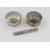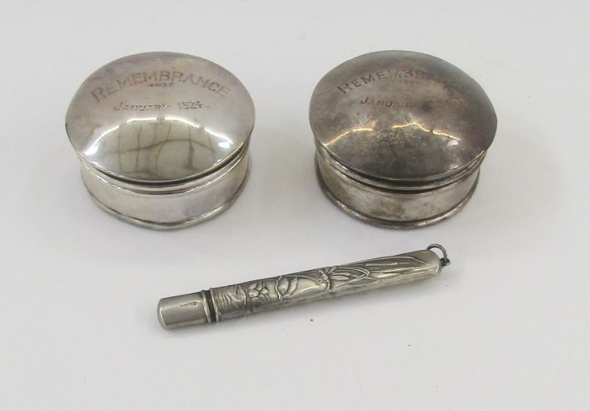 Two circular silver ‘Remembrance’ jewel boxes, one with base missing and a silver cased pencil, figure decorated (3)
