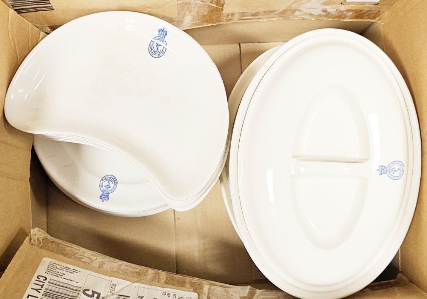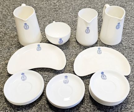 Collection of Royal Navy mess crockery, dating around the 1950's/60's, various makes including WH Grindley, each piece featuring a blue Royal Naval crest on a white ground, items include tureens, kidney-shaped side plates, plate, teacups, saucers, jugs, coffee cans and other items