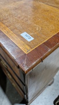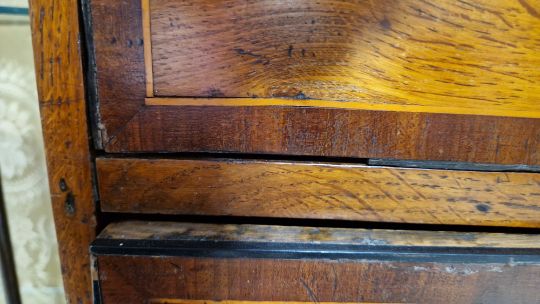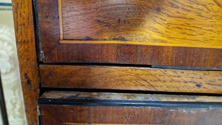 Surface scratches, scuffs and knocks. Fading/discolouration in places. Split to top and both sides. Numerous areas of loss to veneer and moulding, areas of loss to ebony banding around some drawers. Escutcheons missing, one lock missing. Back right foot is splayed. General wear and tear.