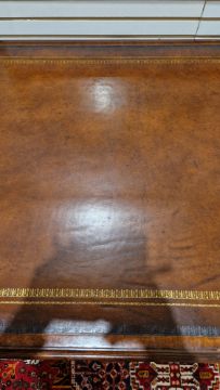 Brights of Nettlebed twin-pedestal desk in the George III manner, the rectangular top with brown leather inset writing surface over an arrangement of eight cockbeaded drawers with brass swan loop handles, the middle drawer with drop front, on bracket feet, 77cm high x 122cm wide x 76cm deep