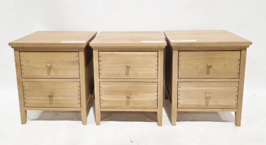 Three modern matching pale oak bedside cabinets, each of rectangular form with two drawers and oak knob handles, on square tapering legs, 60cm high x 50cm wide x 46cm deep (3)