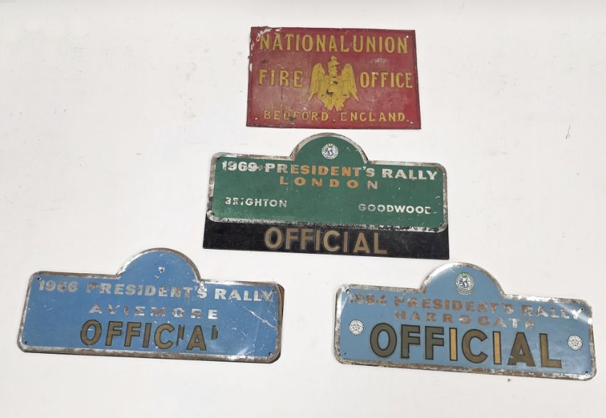 ' National Union Fire Office, Bedford, England ' tin fire mark sign with raised yellow lettering on a red ground, 30cm x 20cm together with three 1960's BP automobile club ' President's rally official ' signs for Aviemore 1966, Harrogate 1964 and London 1969, 40cm x 18cm  (4) (please note VAT will be payable on the hammer)