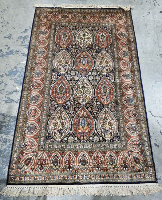 Persian-style silk midnight blue ground rug with three rows of three floral and stylised bird medallions on floral field, multiple floral borders, 210cm x 122cm