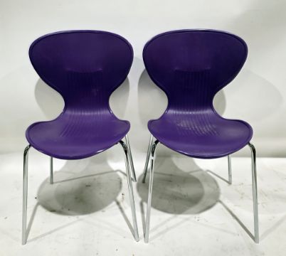 Eight purple stackable cafe bistro chairs with polypropylene shell seats with ribbed backs, on tubular chrome plated frames, each 81cm high x 40cm wide x 45cm deep (8)