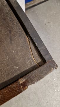 Surface scratches, scuffs and knocks. Split to top, split to candle box lid. Area of loss to the moulding under lock. No lock mechanism. Repair around lock area on underside of lid. General wear and tear.