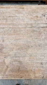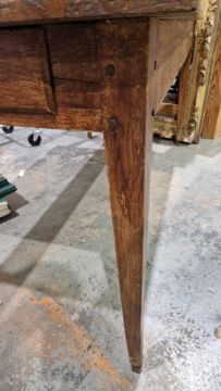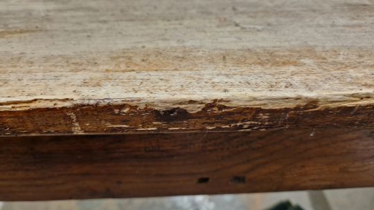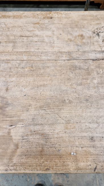 Surface scratches, scuffs and knocks. Fading/discolouration and stains. Splits to top and two of the legs. Areas of old worm. Repaired section to one leg. General wear and tear.