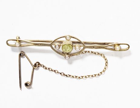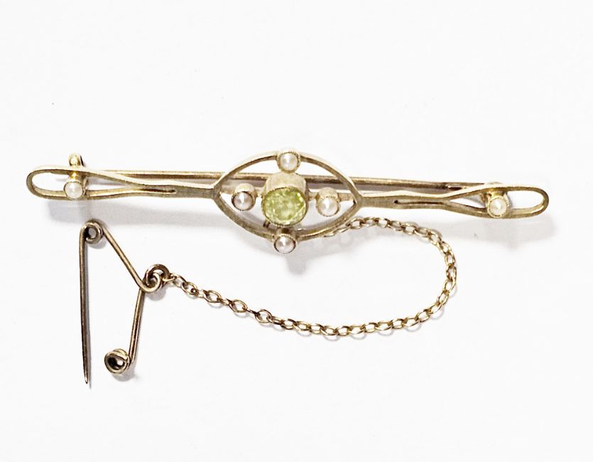 Edwardian yellow metal brooch set with a single citrine flanked by four small seedpearls and a further two seedpearls, with guard chain, approx. 3.4g