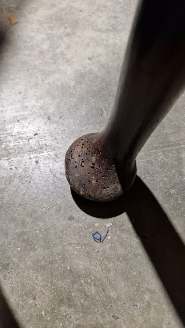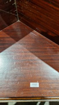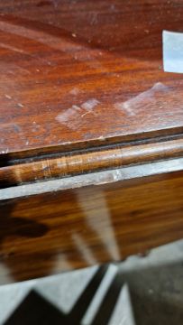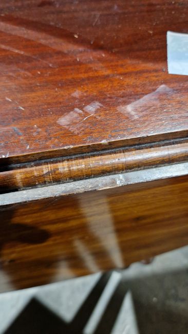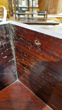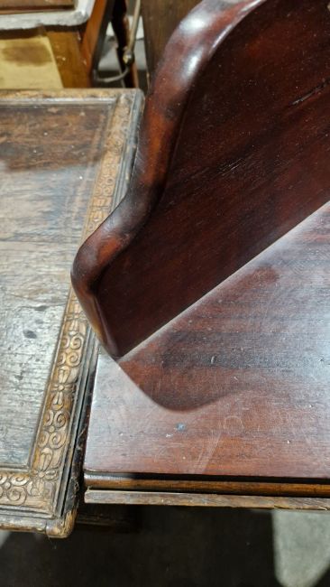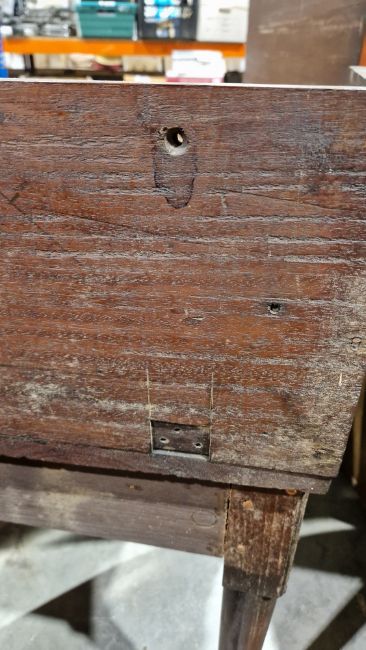 Surface scratches, scuffs and knocks. Gallery with repaired section, screw holes, split and hinge cut outs to back. Old worm on two pad feet. General wear and tear.