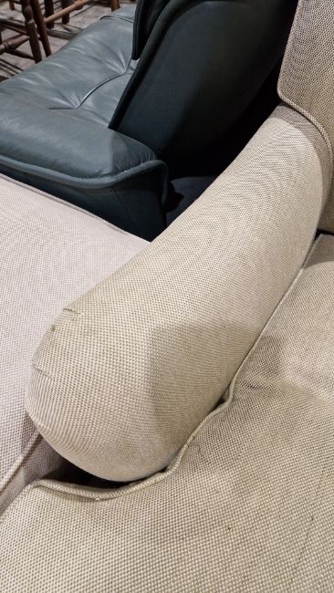 Some loose threads, minor stains to upholstery and possible fading/discolouration. Scuffs to legs. Label states manufactures in 1999. General wear and tear.