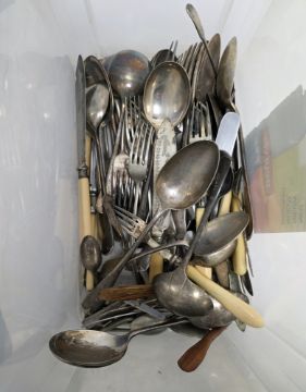 Large collection of silver plated flatware, mainly early 20th century, including a soup ladle, knives, forks, spoons, fish knives and forks, teaspoons, sauce ladle, etc