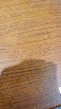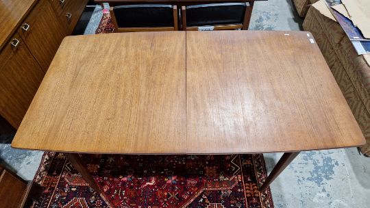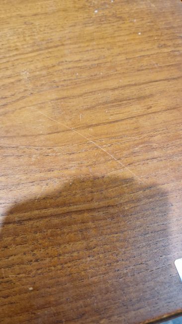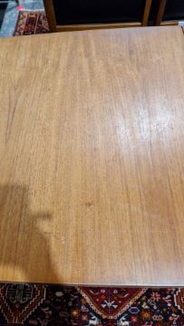 Surface scratches, scuffs, fading/discolouration and some stains to top. One wooden bar missing from underside of one leaf, two legs with loose and separating joints. One runner loose, with repairs and area of loss at one end. another runner with loss to the end. Top has been put on the wrong way around. General wear and tear. Extended length - 193cm