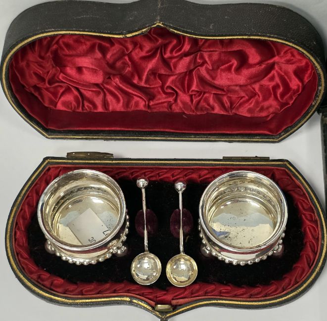 Cased Victorian silver pair of salts and salt spoons, Birmingham 1892, Hilliard & Thomason, the salts of round form with beaded border and three ball feet, the spoons with gilt lined bowls, fitted in a leather case with red lined interior, approx total weight 1.99ozt and a cased set of 12 late 19th/early 20th century white metal teaspoons with shell bowls and engraved handles