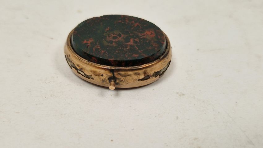 Collection of jewellery including a cameo brooch in an open scrollwork yellow metal mount, 5cm high, a 9ct yellow gold fob set with an oval bloodstone and cornelian (damaged), a yellow metal hinged bangle with safety chain, a black bar brooch set with seedpearls, a carved jade pendant on a yellow metal chain, a 9ct yellow gold and jade disc single earring  Condition Report Bar brooch with central seed pearl missing, clasp broken. Fob with surface scratches and losses to metal around sideAll other items in good order with general wear and tear.jade pendant 4cm x 2.7cm