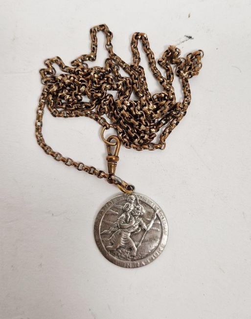 19th century yellow metal curved mourning brooch containing a locket of hair, a yellow metal and lapis lazuli brooch, two bar brooches, a curb link bracelet, a marcasite and white metal flower brooch, a white metal fob chain, a sterling silver St Christopher pendant and other chains and jewellery items