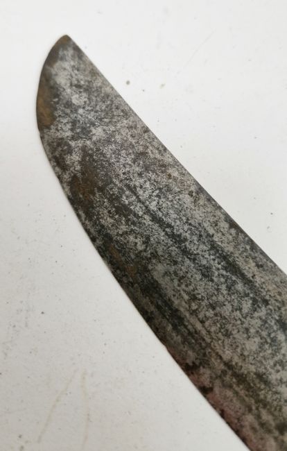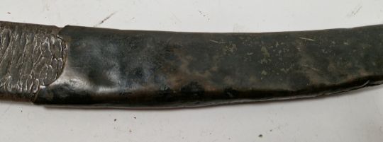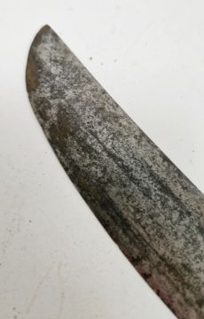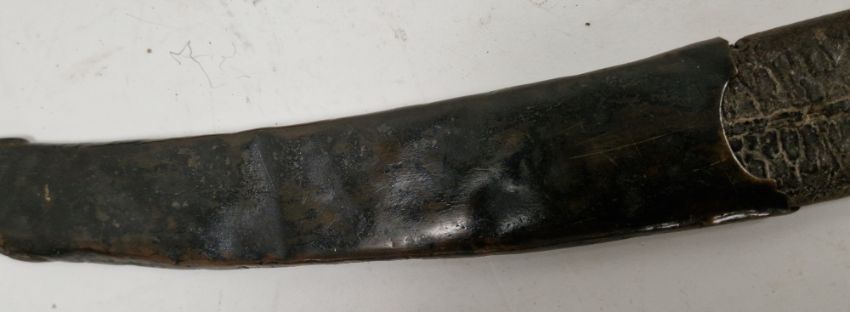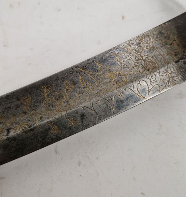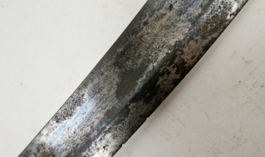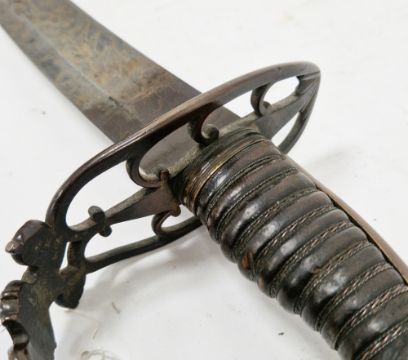 British 1803 pattern infantry flank officer's sword by Osborn & Gunby, etched foliate decoration throughout the curved blade, etched 'Osborn & Gunby, Warranted' with royal cypher to one side, pierced and moulded knucklebow guard with GR cypher, lion's head pommel, leather grip, with original leather and metal mounted scabbard, blade measures approximately 30 1/2 inch Provenance By family repute owned by an officer stationed on St. Helena, who was responsible for  standing guard over Napoleon while prisoner on the island.  Condition Report Blade - Surface scratches and scuffs. Some tiny nicks to the blade edge. Majority of bluing now gone, tarnishing and areas of rust to the blade. Blade is straight. Dents to the metal on back of handle and near guard. Area of loss to the wooden handle beneath the pommel. Scabbard -  Scratches, scuffs, splits and perishing to the leather. Metal mounts with scratches, scuffs, dents and splits. Area of loss to the metal tip of scabbard. General wear and tear.