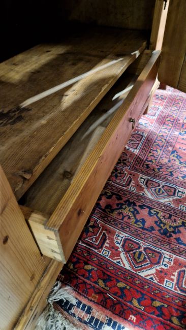 19th century pine larder/linen cupboard, the single panel door opening to four deep fixed shelves, with interior drawer below, on square feet, 177cm high x 84cm wide x 58cm deep