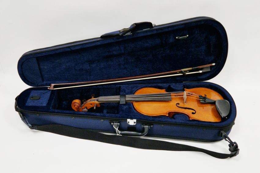 Violin with two piece back and ebony fingerboard, 60cm long together with a new bow, fitted in a Hindersine canvas case