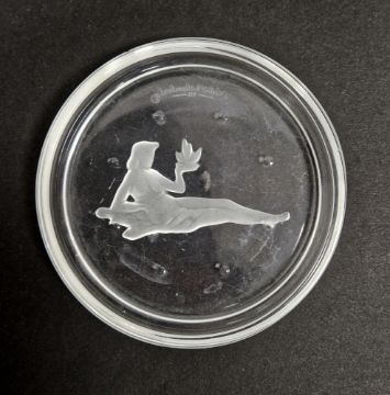Victorian silver-mounted cut-glass tapering cylindrical bottle cooler, the rim hallmarked, London, 1897, with swing handle, cut with hobnail pattern, 14 cm high, together with a Val St. Lambert pin tray decorated with a reclining female nude, etched marks, 8.7 cm. diam. (2)