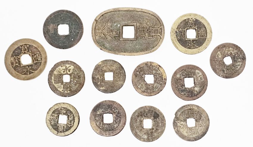 Collection of 13 Japanese and Chinese bronze cash coins including a Tenpo Tsuho coin from the Edo period (13)