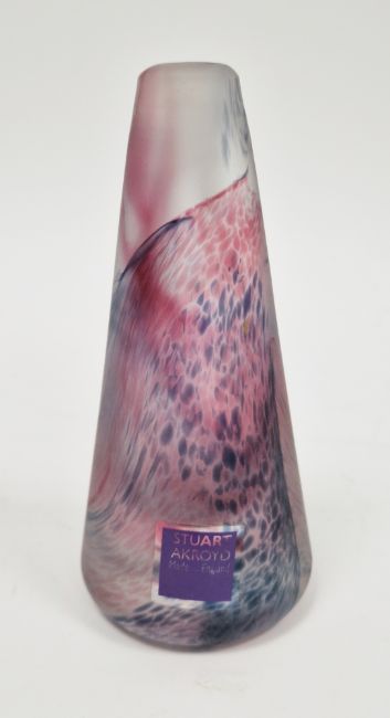 Stuart Akroyd studio glass conical perfume bottle, cased in pale purple and blue with teardrop-shape casing, applied with studio label, etched initials S.A. to base, 11.5 cm high (end of stopper broken)