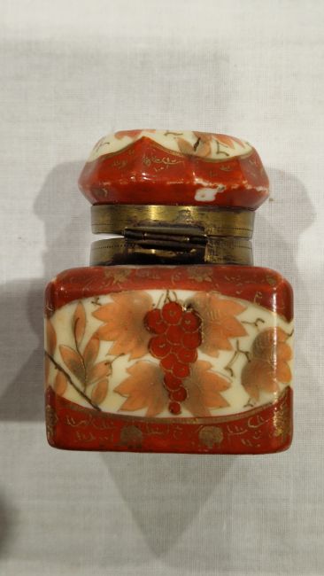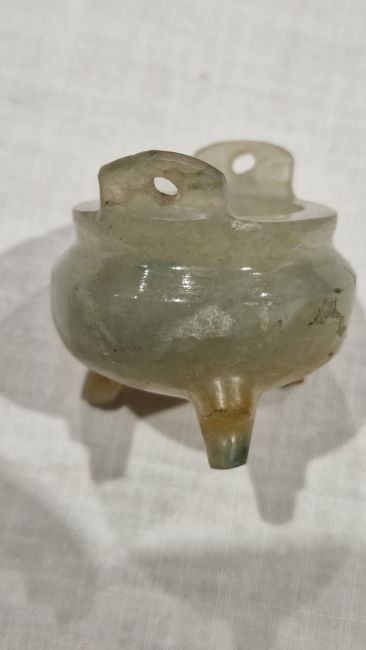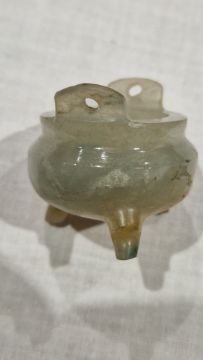 Pair of Japanese cloisonne small oviform vases decorated with wisteria, a pair of Kutani porcelain gilt metal mounted inkwells and covers, a pair of contemporary Chinese porcelain models of Dogs of Foo, turquoise glazed, a pair of 20th century Chinese Cong-style miniature vases on wooden stands, a jadeite miniature tripod sensor on stand, a carved stone model of a recumbent buffalo, a carved hardwood figure of a reclining nude woman and a contemporary celadon glazed porcelain footed bowl (12)  Condition Report Celedon bowl - chip and repair to rimInk wells - Light surface marks, wear to decoration and gilding, ink stains to interiorCloisonne vases - One vase with two areas of loss to enamelCong-style vases - Both with crazing, one with chip to corner of foot, the other with chips to all corners of footBuffalo - Light surface marks, chip to back leg and small chip to nose.All items with general wear and tear.