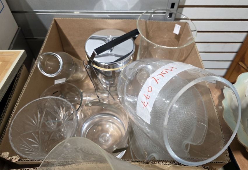 Six boxes of assorted glass, ceramics and other items including silver plated caddy spoons, flatware, flower vases, press moulded glass, cocktail shaker, drinking glasses, a pair of Prinz 8x30 binoculars, flatware, set of six boxed champagne flutes, a boxed set of six 'Classic' medium wine glasses by David Mellor Design and a framed watercolour by Diana Scott of a cottage door and other items