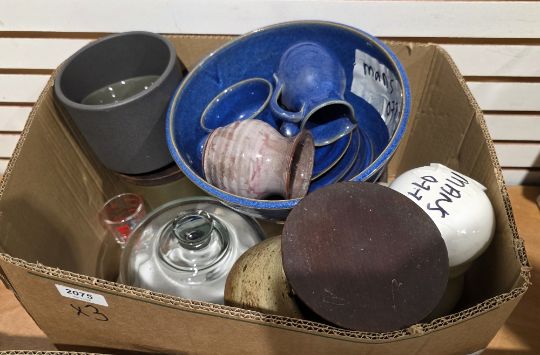 Three boxes of assorted ceramics and glass including a Chinese export porcelain teabowl and saucer, two ginger jars and covers, various decanters, stoppers, vases, water jugs including a blue tinted posy vase and other items