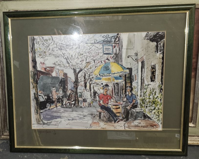 Still life of fruit and ewer, signed lower right, framed and glazed and assorted paintings and prints