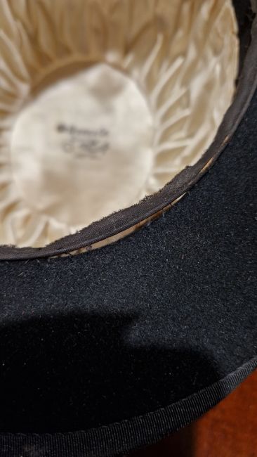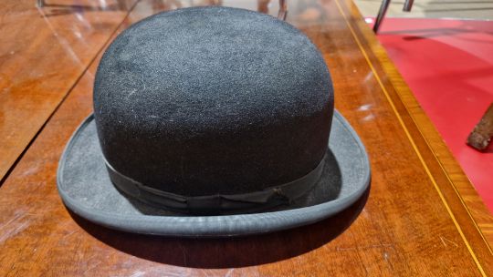 Bowler hats with surface scuffs, accretions. Staining to interior lining. Red silk on one has come away. Both with losses to material and fraying around head opening. General wear and tear.