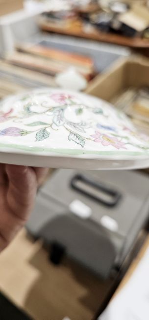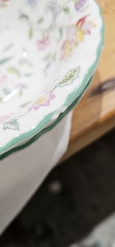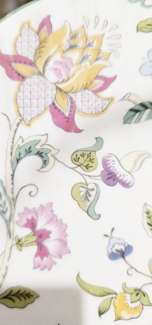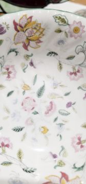 Minton bone china Haddon Hall pattern part dinner service for eight, printed brown marks, including two oval two-handled vegetable tureens, a sauceboat on stand, part tea service, oval serving dish, cake plate, eight dinner plates, eight salad plates and other items  Condition Report Dinner plate diameter - 27cmGeneral wear and tear throughout. Surface scratches, pattern fading adn loss to many items. Small chip to the lid of one tureen. Small chip to the base of one tureeen. Crack to "serena" bowl. Misprint of transfer where pattern meets hte handle as well as a crack where the spout meets the body of the teapot. Staining to the spout. Stains to interior of sauceboat. Small crack/firing fault to the base of its' stand. Stain to the interior of the jug. Small chuip to the base of one teacup and a chip to one further. Large chip to one bowl. Please see additional pictures.
