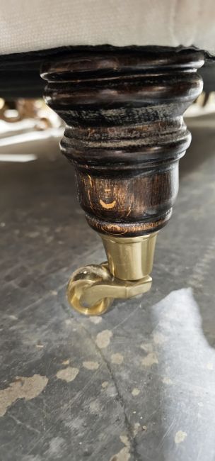 S Rouse & Co of Cheltenham two-seater sofa, shaped in the 19th century manner, with cream upholstery, on turned tapering wooden legs with brass caps and castors, with two loose cushions, 83cm high x 168cm wide x 90cm deep  Condition Report Some marks and dirt. Wear to legs and castors. Seems solidly constructed. Does not appear to creak when sat on. Please see additional photos.