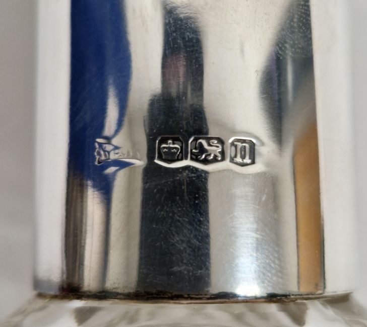 George V silver-mounted decanter by Walker & Hall, Sheffield 1930, with shaped cut glass body and flared silver collar, 30cm high, and a cut glass vase with silver collar, 17cm high (2)