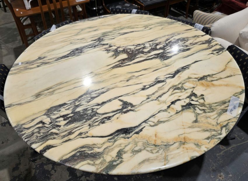 Mid-century Italian dining table with circular marble top, on a tubular chromed hexagonal base united by stretchers, 72cm high x 170cm diameter
