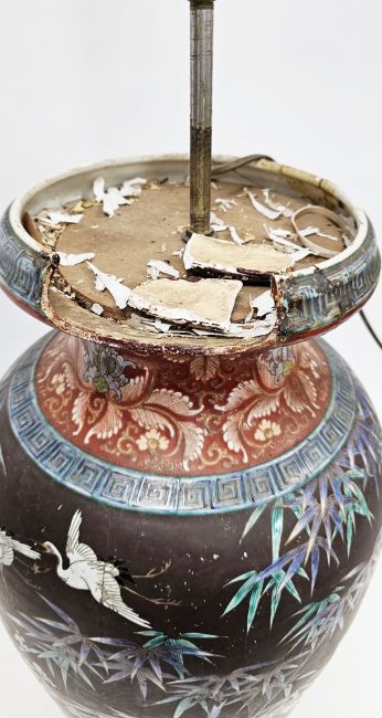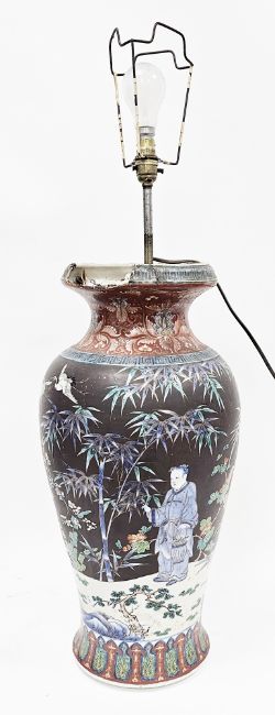 Large Japanese late Meiji period (1868-1912) inverted baluster vase, iron red character marks to base, painted in underglaze blue with figures amongst bamboo, reserved with cranes in flight and flowering prunus, in overglaze enamels above a landscape panel and lappet pattern foot rim (adapted as a lamp) (losses, damage and restoration to rim), 65.5cm high