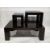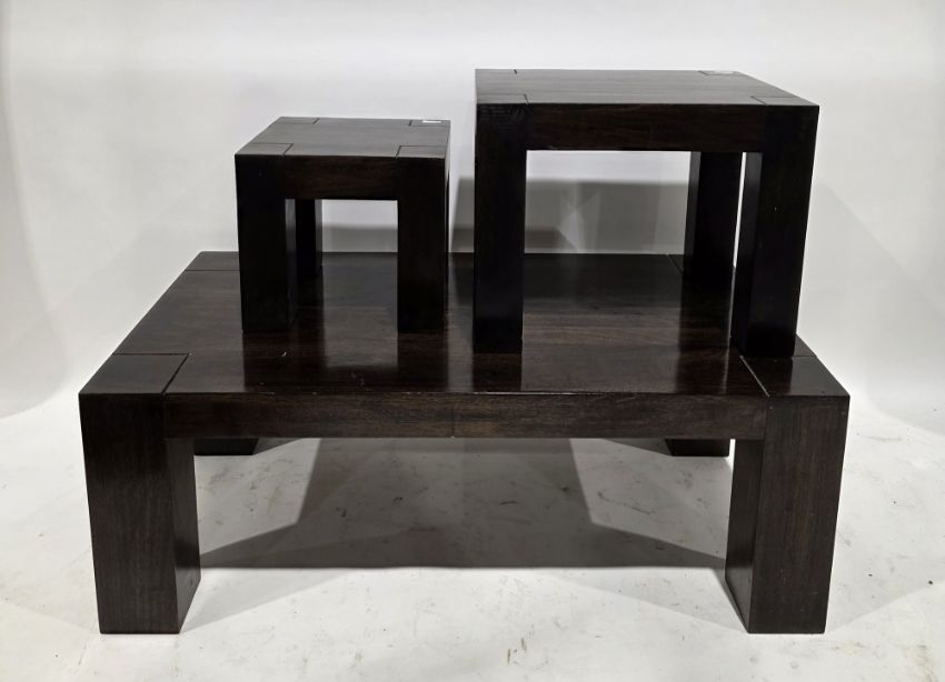 Modern set of three dark hardwood coffee tables retailed by Ultimate Products, each table on substantial square legs, largest 40cm high x 110cm wide x 59cm deep