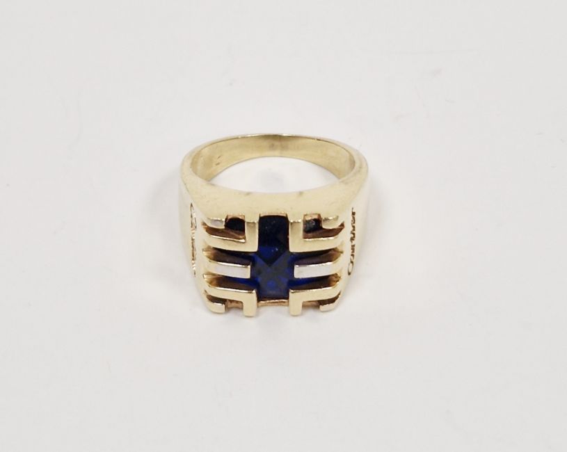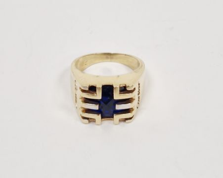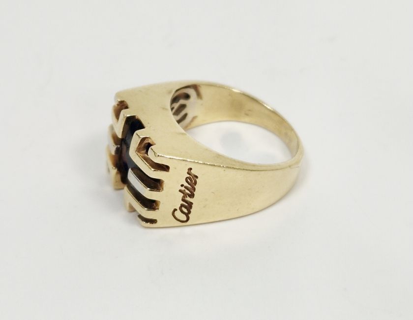 Gold Le Baiser du Dragon ring, the shoulders signed 'Cartier', the Chinese inspired setting surrounded by faceted blue stone, marks to shank worn, finger size M, 10g approx