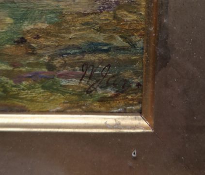 Late 19th/early20th century Oil on panel Rural scene with figures and dog on country path, indistinctly signed lower right, framed and glazed, 22cm x 38cm