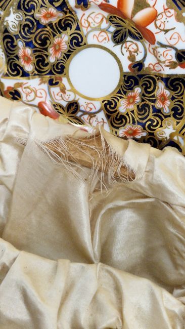 Good overall condition. One cup with small chip to rim. Hole in silk lining. Case with some scuffs. General wear and tear.