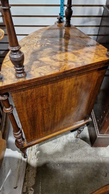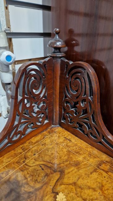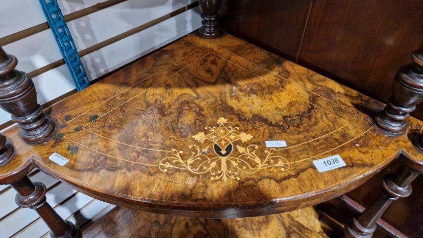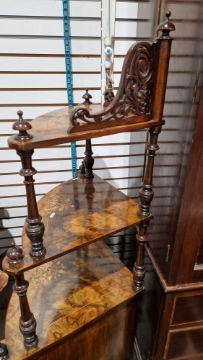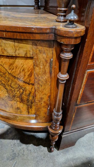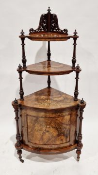 Victorian burr walnut corner bowfronted whatnot, the two graduated shelves over a single panel cupboard door, pierced carved scrolling top rail, turned baluster supports with finials, on castors, 158cm high x 71cm wide x 48cm deep  Condition Report Surface scratches, scuffs and knocks. Fading/discolouration. Possibly a couple of sections of repair to veneer but could have been done during manufacture, see photos. Key is present. General wear and tear.
