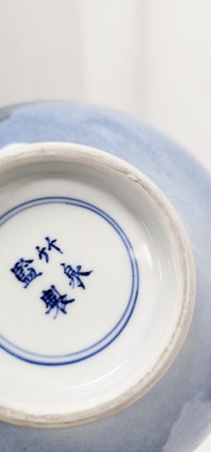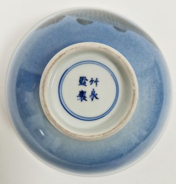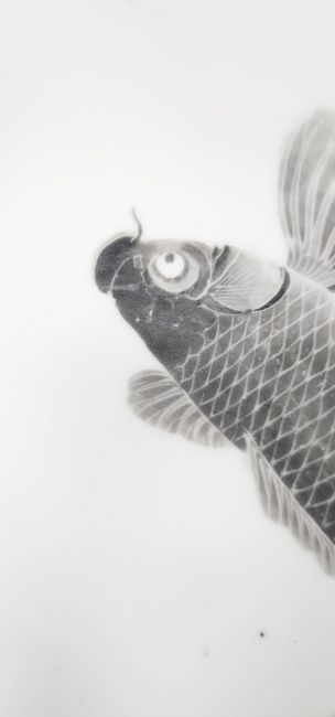Japanese porcelain bowl, late Meiji period/early 20th century, attributed to Miura Chikusen, signed with four character mark within double concentric lines, painted with koi carp, engraved on a mottled blue ground to the exterior, the interior with a single large koi carp, 20cm diameter  Condition Report General wear and tear commenserate with age and use. Marking/fouling  to interior of bowl. Small chipp/scuff to foot. Please see additional images.