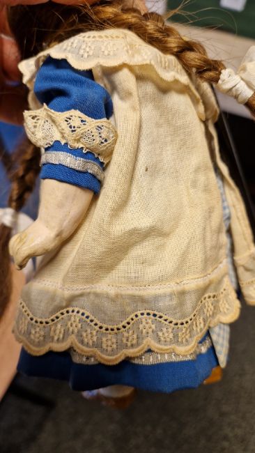 Light surface scratches and scuffs. Small area of loss to one foot. Clothing with some marks and light stains. General wear and tear.