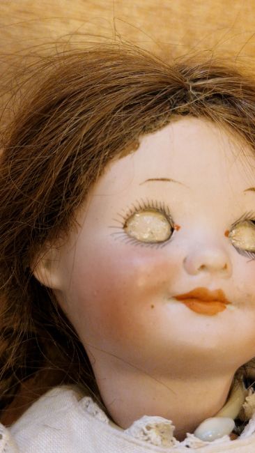 Armand Marseille bisque headed doll with sleeping blue eyes, closed mouth, blue and lace dress marked A 6/0 M to back of head, 22cm tall