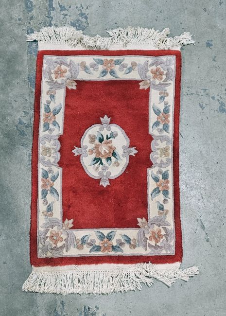 Chinese red ground superwash rug with central floral medallion, single floral border, 99cm x 62cm