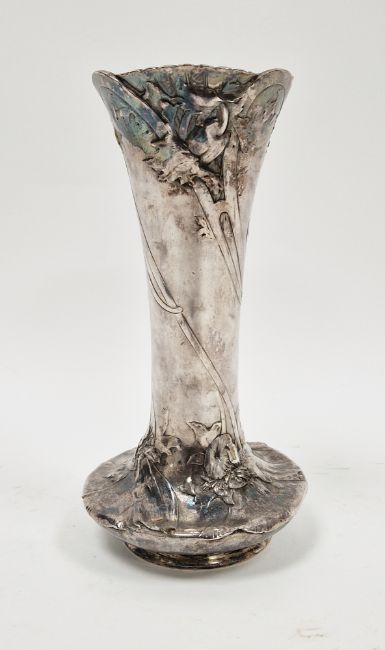 Christofle silver-plated Art Nouveau vase, circa 1900, stamped Christofle, numbered 1952805, of flared slender form, cast with flowers and whiplash ornament in low relief, 21.5 cm high