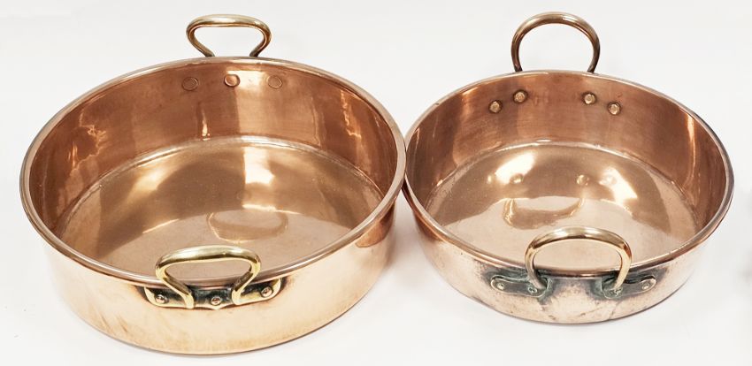 Two 19th century copper preserve pans, one with twin brass loop handles, the other with twin brass loop handles, the largest 38.5cm diameter