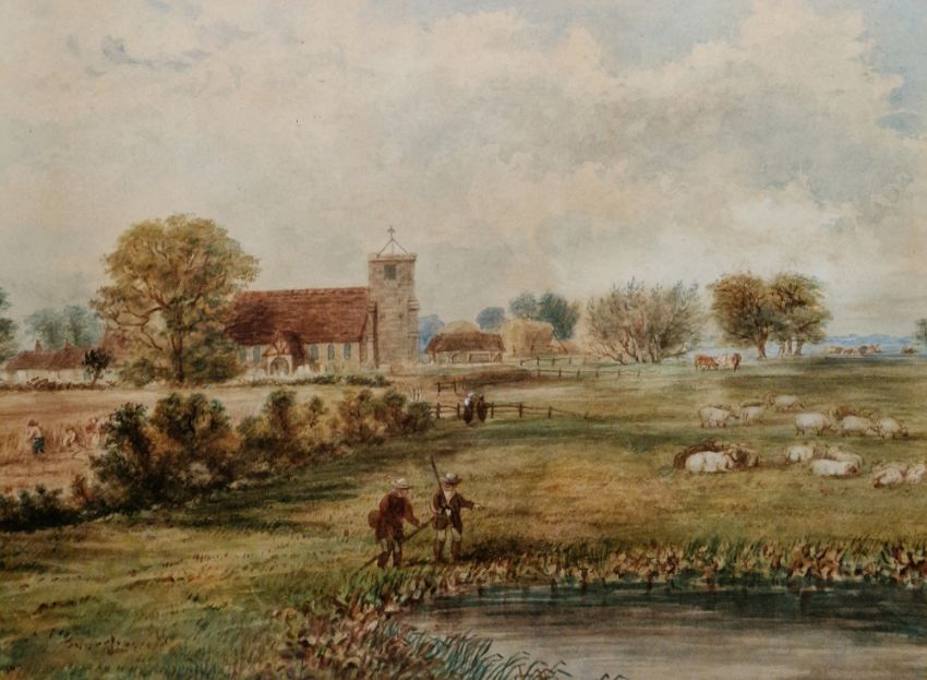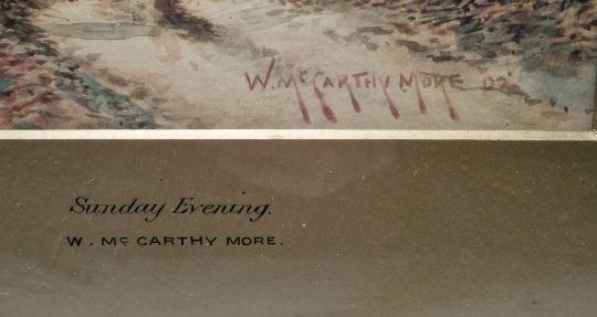 W. McCarthy-More (19th century) Watercolour "Sunday Evening" two figures on a country path at sunset, church beyond, signed and dated 1902 lower right, framed and glazed, mount aperture 34cm x 24cm, together with another watercolour depicting a rural scene "The Cross Roads", by the same hand and a George Constable watercolour, "Lyminster Church", framed and glazed, mount aperture 34.5cm x 46.5cm (3)