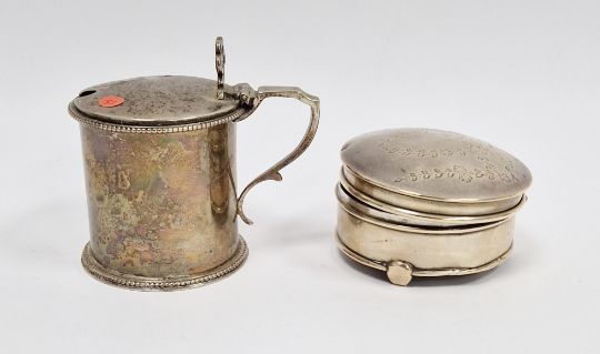 Victorian silver lidded mustard pot, of cylindrical form, lacking glass liner, hallmarked London 1875 by William Edwards, 3.8ozt, together with a Silver trinket pot on three small feet, marks rubbed (2)