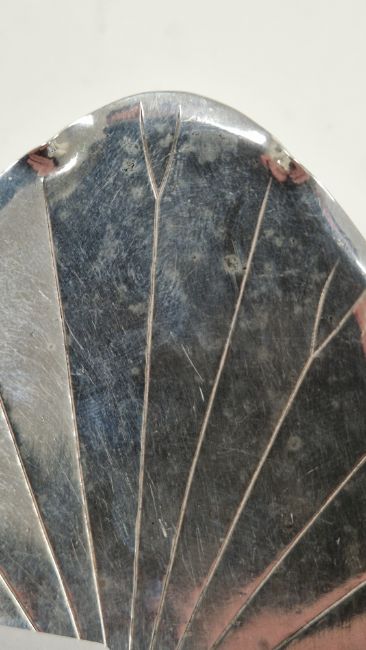 Light surface scratches and accretions. Slightly sloping on one side. General wear and tear.