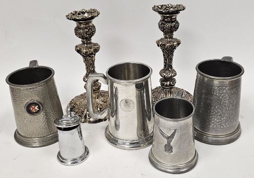 Quantity of metalware including pair of silver plated candlesticks with floral decoration, pewter mugs, entree dishes, etc (please note VAT will be payable on the hammer)