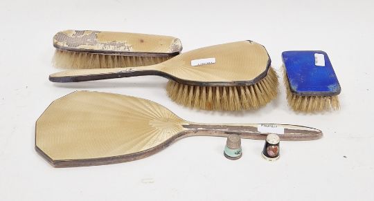 Enamel and silver-backed three-piece dressing table set comprising mirror and two brushes, another enamel and silver-backed brush and two modern enamel and silver thimbles